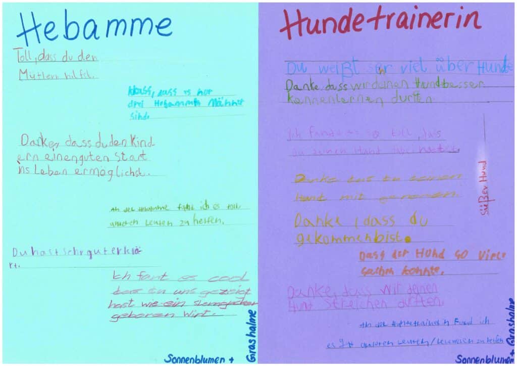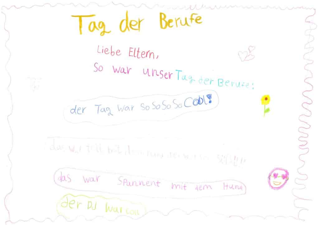 Wir haben dazu Eltern eingeladen, ihre Berufe zu präsentieren. Bei dieser tollen Veranstaltung hatten unsere Schüler*innen die Möglichkeit, zu erfahren, was man braucht, um Hundetrainerin, Hebamme, DJ, Filmemacher und Keynote-Speaker oder Psycholog*in zu werden.
